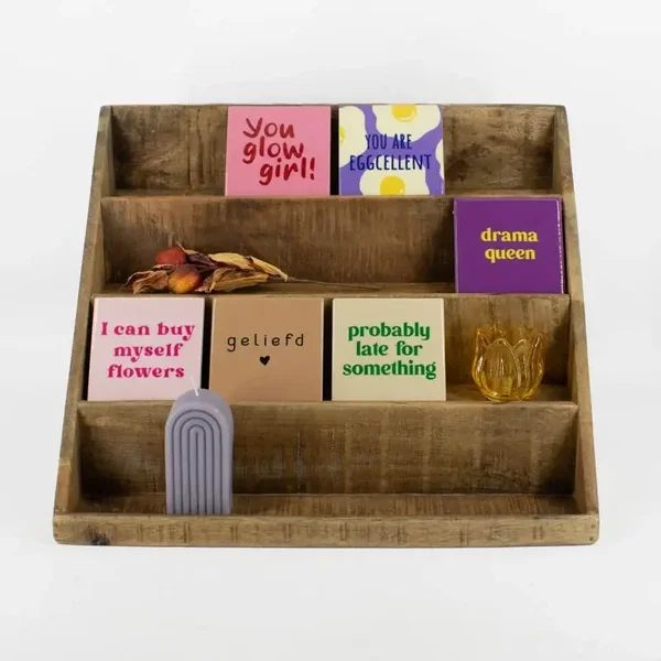 Bij VED vind je een collectie keramieke tegeltjes met leuke teksten.
